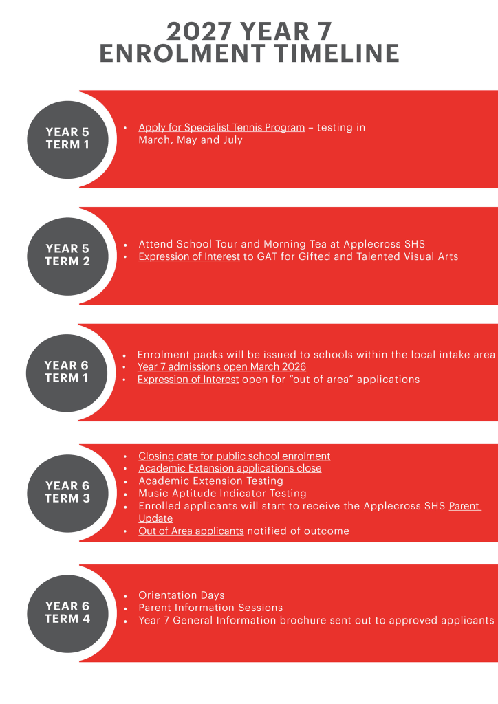 Application for enrolment at a Public School can take place at any time. The recommended date for applications to enrol in Year 7 2026, is by Friday 25th July 2025.
